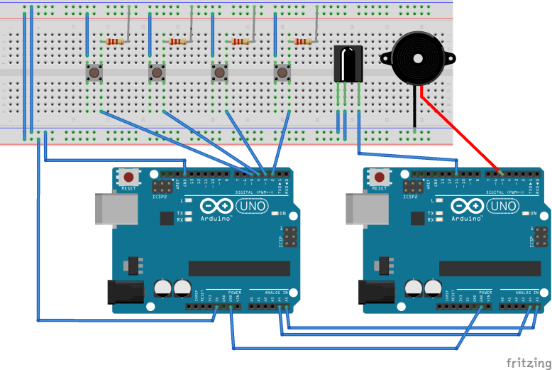 Comunicarea între cei doi arduino am facut-o folosind protocolul I2C(am folosit cam aceleași principii ca și la Chat-ul cu 2 arduino).